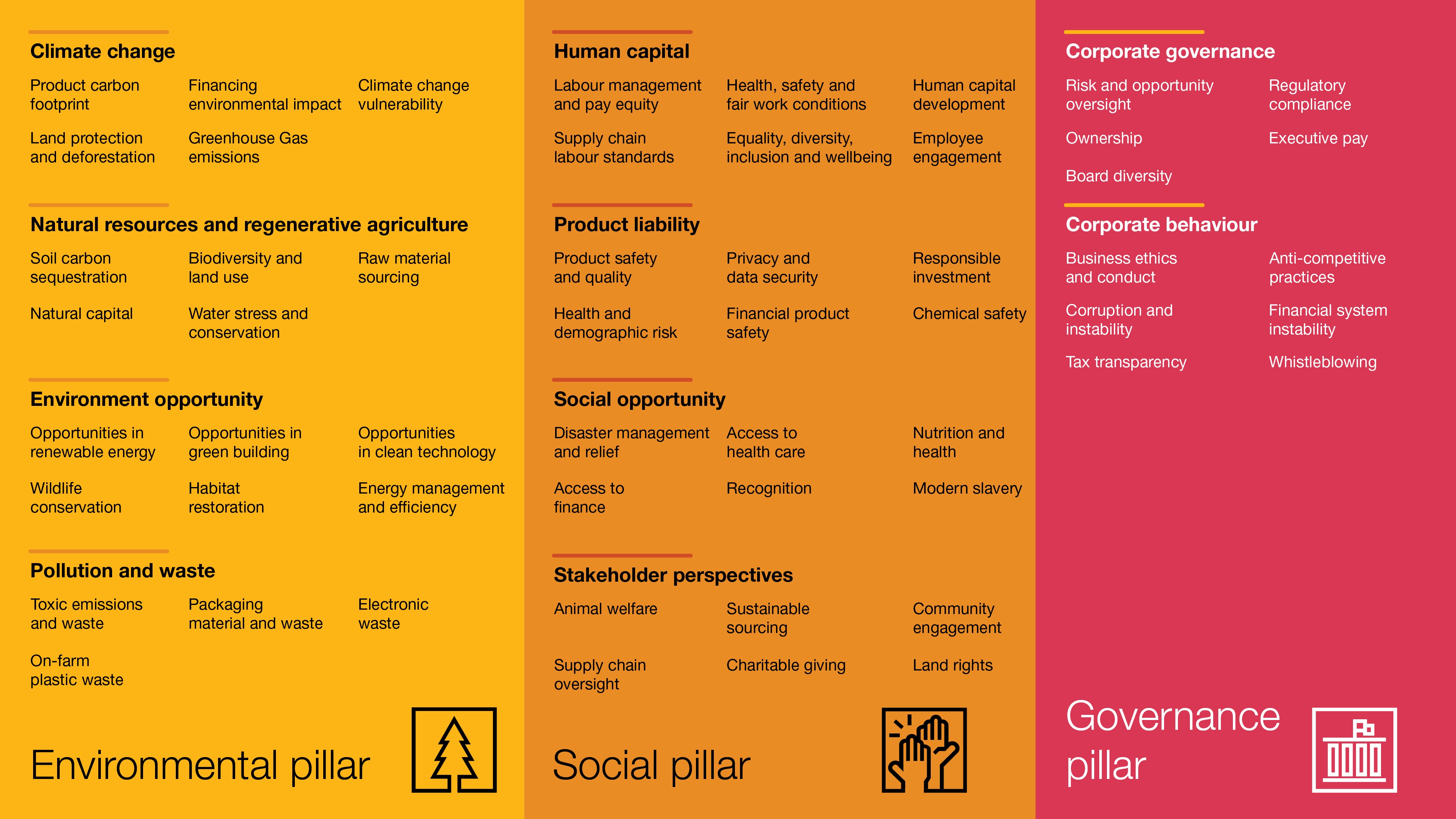ESG encompasses three main areas, as seen under each pillar below. In short,